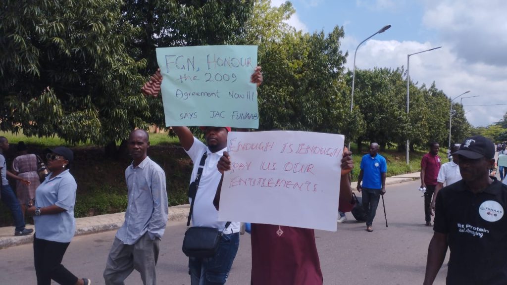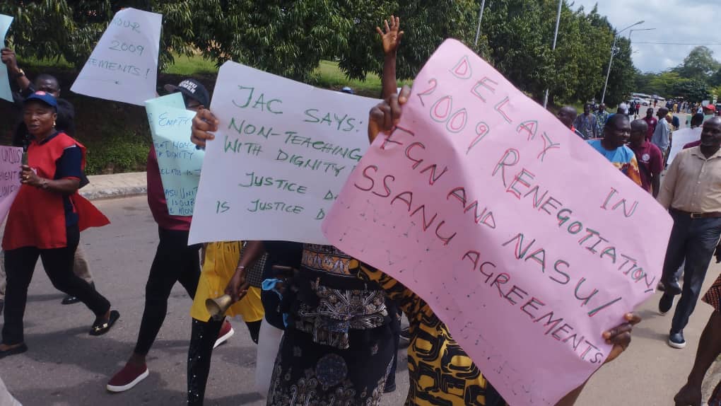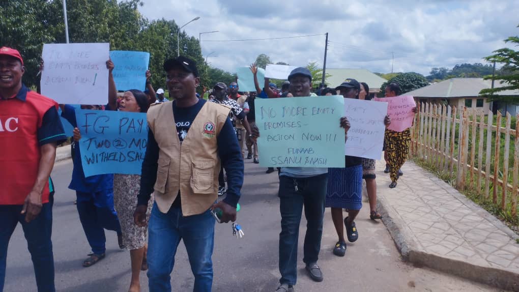 The Senior Staff Association of Nigerian Universities(SSANU) and Non-Academic Staff Union of Educational & Associated Institutions (NASU), Federal University of Agriculture, Abeokuta(FUNAAB) Chapter, have joined their counterparts nationwide to stage a one-day protest over delay in the implementation of 2009 Negotiation.