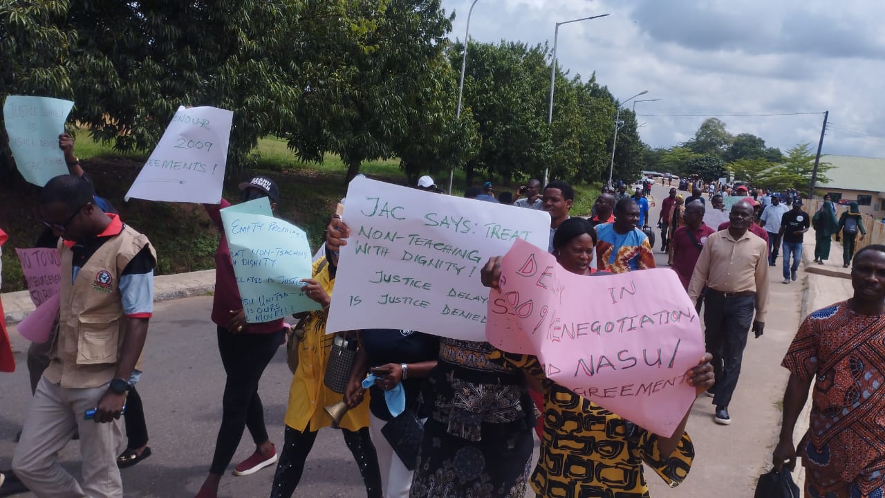 Under the aegis of Joint Action Committee(JAC), the two Unions on Thursday held a peaceful protest on campus to register their grievances over the inability of the federal government to honour agreements reached with the unions and pay all outstanding money owed to them.